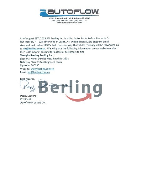 美國AUTOFLOW公司于2015年8月28日授權我公司為中國區代理