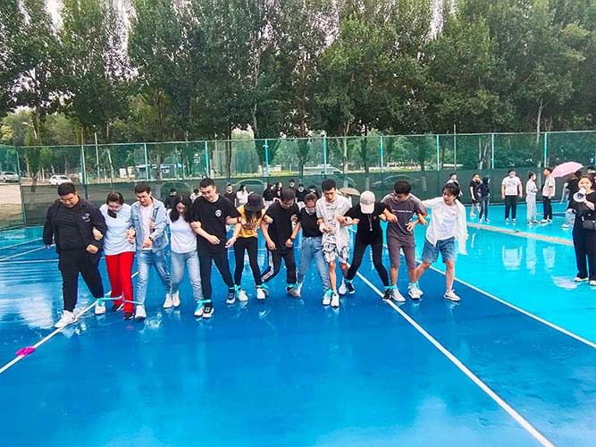 大家一排站好,從左到右,每人的右腿與另一人的左腿依次并齊,并用扁帶繩子系上,繩子綁的位置是腳踝以上部分。聽見哨聲即為游戲開始,從起點到終點,按用時由短到長,取前五名依次加分。